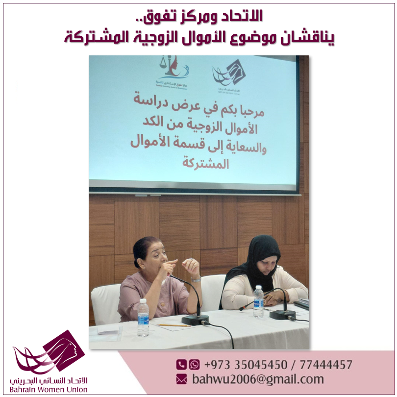 نظم الاتحاد النسائي البحريني برعاية مركز تفوق الاستشاري للتنمية ،فعالية تتضمن عرض ورقة بحثية للباحثة المحامية زهراء صالح، تحت عنوان " الأموال الزوجية من الكد والسعاية إلى قسمة الأموال المشتركة".