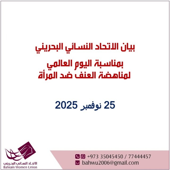انطلاقاً من الالتزام الإنساني والمجتمعي العميق تجاه حماية المرأة وصون كرامتها، وتزامناً مع إحياء اليوم العالمي للقضاء على العنف ضد المرأة الذي يصادف الخامس والعشرين من نوفمبر من كل عام، يؤكد الإتحاد النسائي البحريني في مملكة البحرين موقفه الثابت والراسخ في مواجهة جميع أشكال العنف التي تتعرض لها المرأة، سواء كان عنفاً جسدياً أو نفسياً أو اقتصادياً أو اجتماعياً أو رقمياً.