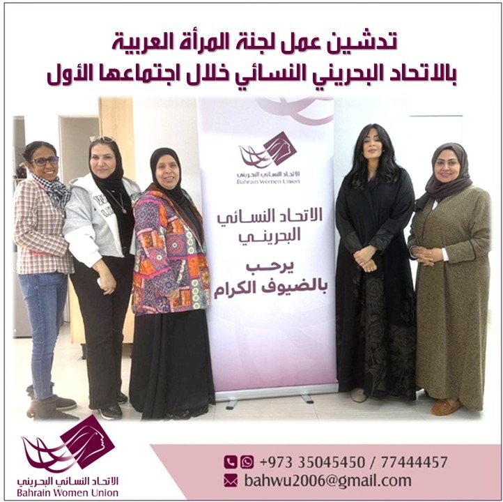 عقدت لجنة المرأة العربية التابعة لـ الاتحاد البحريني النسائي اجتماعها الأول يوم الأربعاء 21 يناير، بمقر الاتحاد النسائي البحريني، برئاسة الدكتورة سمية الجودر، وبحضور العضوات الأستاذة فوزية ربيعة، الأستاذة وهيبة عبدالرحمن الفارسي، الأستاذة زهرة اشكناني، والمهندسة أميرة الحسن، وذلك في إطار تدشين عمل اللجنة وبحث توجهاتها المستقبلية ضمن رؤية عربية مشتركة.